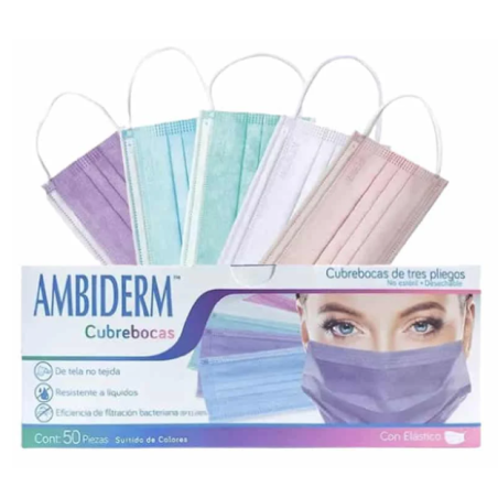 Mascarillas quirúrgicas de tres pliegos con filtro antibacterial, elaboradas con tela no tejida en colores. Eficiencia de filtración bacteriana (BFE) mayor o igual a 98%