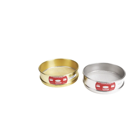 Los tamices de prueba de 8 pulgadas con marco de latón y alambre de latón de altura completa incluyen números de serie y un certificado de conformidad. Los tamices de prueba de 8 pulgadas tienen una profundidad de 2 pulgadas (5 cm) y los de media altura de 1 pulgada (2,5 cm). Los tamices de 8 pulgadas no están disponibles en altura intermedia. Para obtener tamices de otros tamaños o para obtener los mismos tamices con certificación NIST, contacte a su representante de ventas.